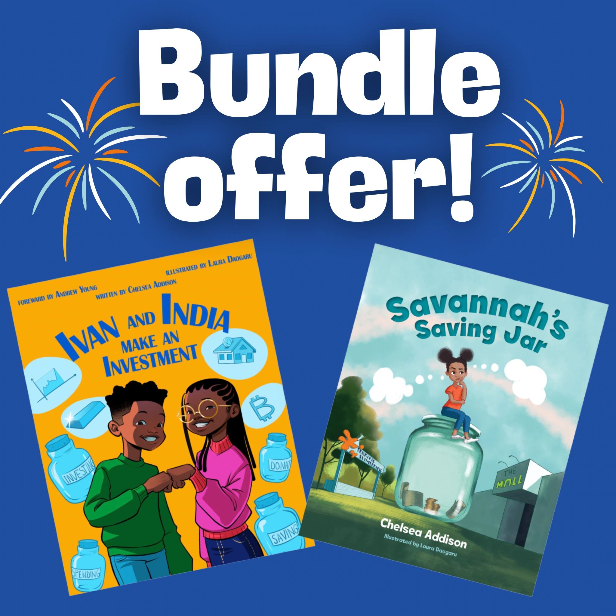 Get both "Ivan and India Make an Investment" and "Savannah’s Savings Jar"—engaging and relatable stories that teach children the power of spending their money wisely and investing using group economics.